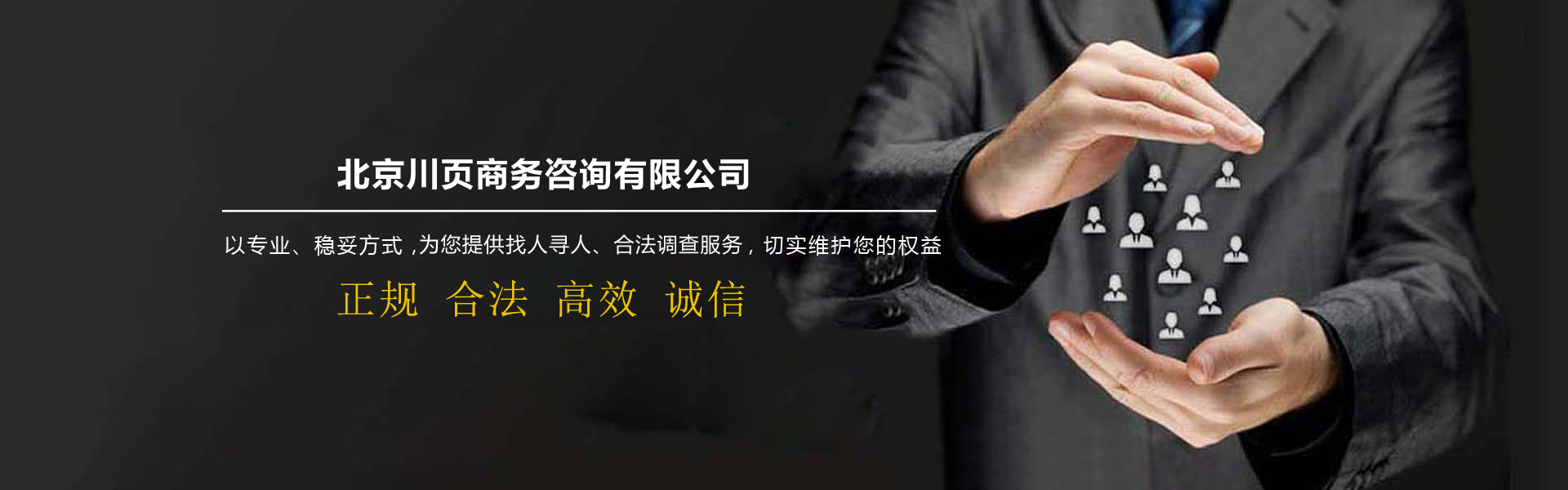 北京市偵探公司-北京川頁商務咨詢有限公司是面向全國提供找人尋人服務平臺,公司致力于為企業(yè)、個人解決發(fā)展中各類債務問題、債權訴訟、債權轉讓事務,幫助快速尋找親人、朋友、戀人、戰(zhàn)友等找人服務,以及婚姻家庭情感咨詢等業(yè)務。公司擁有一批律師,商賬管理師專業(yè)的工作人員,依托互聯(lián)網(wǎng)平臺,在國內形成了完善的調查尋人服務網(wǎng)絡,業(yè)務范圍已經(jīng)逐漸覆蓋北京及全國各大主要城市和地區(qū)。我們始終秉承"捍衛(wèi)真理、堅持誠信、以人為本、奉獻社會"的服務理念和"專業(yè)、創(chuàng)新、和諧、共贏"的經(jīng)營理念,我們希望通過提供全面、及時、準確、專業(yè)的相關信息,以優(yōu)質的服務,專業(yè)的技巧,為各位有需求的人員提供服務!